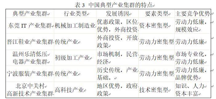 以上5個地區的產業集群并不能完全反映中國產業集群發展的全貌,但從行業類型、發展誘因、要素類型和主要經濟優勢等方面看,這些產業集群各具特點(詳見表3),具有一定的代表性。具體而言,以東莞為代表的IT產業集群主要是依靠外資投入和海外產業轉移發展起來的,這類產業集群關鍵是要保持地區的成本優勢并強化集群內部發育。以溫州為代表的低技術專業化產業集群,其主要特點和優勢就是以高度發達的流通網絡為背景,實現低成本、低技術的經濟規模擴張,但這類產業集群是很容易被模仿的,集群的競爭優勢難以保持,不斷增加技術投入是保證其進一步發展的關鍵。寧波的服裝產業集群與其他產業集群的最大區別是它依靠品牌優勢帶動整個產業集群發展,因此它具有獨特的競爭優勢,但如何進一步提升這些品牌的含金量,發揮這些品牌的市場效用,并且逐步打入國際市場是當前寧波服裝產業集群面對的困難。北京中關村的高科技產業集群,在相當程度上掌握了中國IT產業的市場脈絡,培育出中國最有影響力的IT企業和IT人才。但是,作為中國知識和人才最為集中的區域,中關村能否實現國外技術的本地化,能否成為中國IT技術創新的發源地,能否最終成為以創新為主、有自身發展動力的創新型高科技產業集群,決定了中關村未來的長遠發展走向。