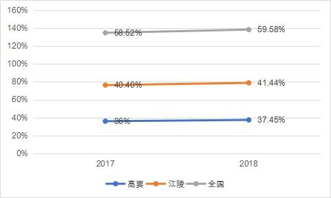 首先,高要區城鎮化滯后全國。首先,2017年和2018年高要區城鎮化率分別為36%和37.45%,這一比率大大低于全國平均水平,同期全國指標分別為58.52%和59.58%;甚至也低于經濟嚴重落后于高要區的湖北省江陵縣,同期江陵縣城鎮化率分別為40.40%和41.44%。
