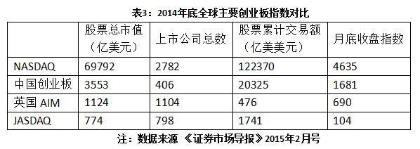 2014年底,比較納斯達克、英國AIM和日本佳斯達克市場,從企業(yè)數(shù)量來看和資產(chǎn)規(guī)模來看,以間接融資為主導的日本和英國愿意按低于直接融資的美國;從換手率來看,英國市場全年不到0.5次,說明市場交易冷清。