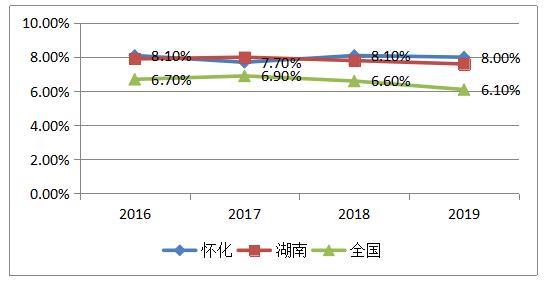 經濟發展水平滯后。2019年懷化市實現地區生產總值1616.6億元,人均GDP為32453元;全市三次產業占比為13.9:27.7:58.4,農業占比偏高,表明工業化程度不夠;2019年全市年末常住總人口498.33萬人,其中城鎮人口244.35萬人,城鎮化率為49.03%,低于同期全國城鎮化率11.6個百分點,低于湖南省平均水平大約8個百分點。