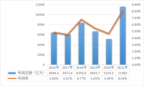 圖3-5 2016-2021年規上企業利潤總額(億元)和利潤率