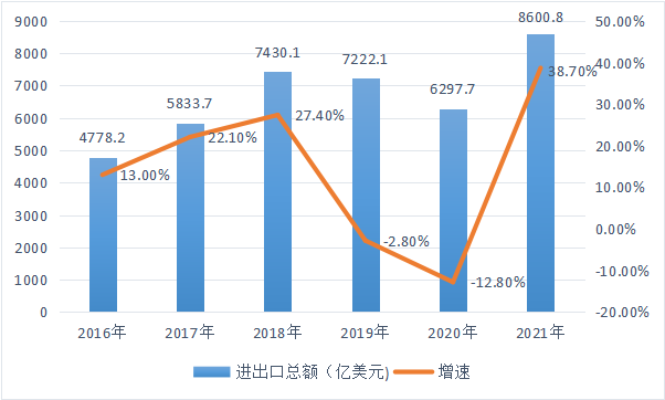 圖3-7 2016-2021年石化行業進出口總額(億美元)和增速