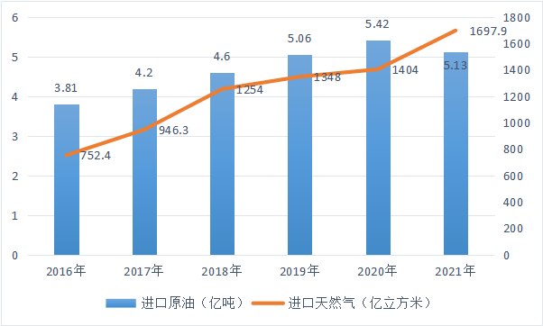 圖3-8 2016-2021年進口原油和天然氣數量