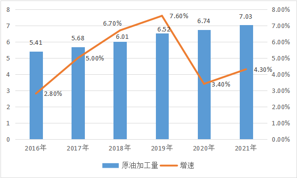 圖3-10 2016-2021年原油加工量(億噸)及增速