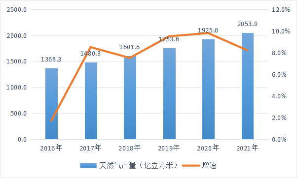 圖3-11 2016-2021年天然氣產量(億立方米)及增速
