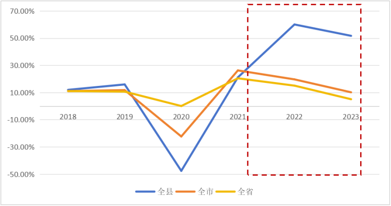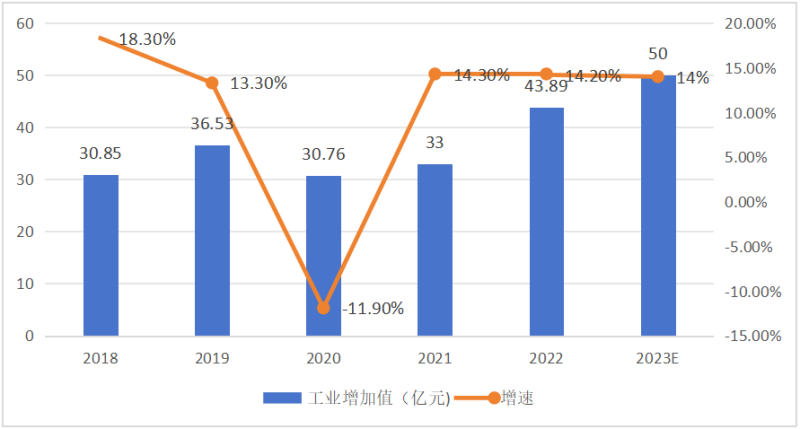 圖表1:2018-2023年江陵縣工業增加值及增速變化