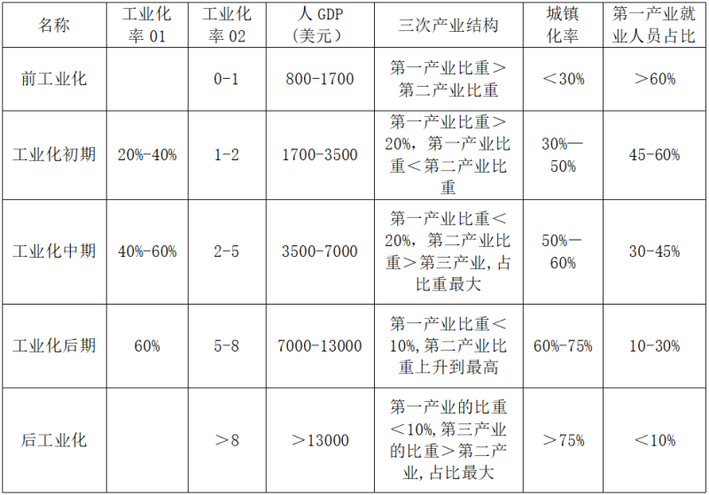 工業化進程一般分為前工業化、工業化初期、工業化中期、工業化后期和后工業化五大階段,根據國際通行的研究成果,主要判斷指標有工業化率、人均GDP、三次產業結構、城鎮化率、就業人口結構等標準。