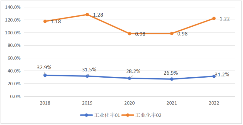 從工業化率來看,有兩種計算方法:工業化率(01)=工業增加值占地區生產總值比重,工業化率(02)=工業增加值與農業增加值的比值。2020年以來江陵縣工業增加值保持兩位數快速增長,2022年工業增加值占地區生產總值比重為31.2%,工業增加值與農業增加值的比值為1.22,處于工業化初期階段。