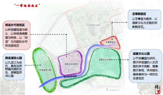 規劃思路:漳州市區西部景觀區的重要組成部分;以林語堂為核心品牌,集西溪濕地公園、林語堂文化園、文化創意產業園、珠里閑適村為一體的近郊文化休閑旅游目的地。文旅融合、景村聯動,以山水風光、村落為依托,融入語堂文化,打造獨具特色的語堂文化品牌。 整治村莊環境,還原傳統韻味,村落與林語堂文化園、西溪公園及規劃文化創意產業園聯動開發。形成“一帶兩園兩區”的空間結構。