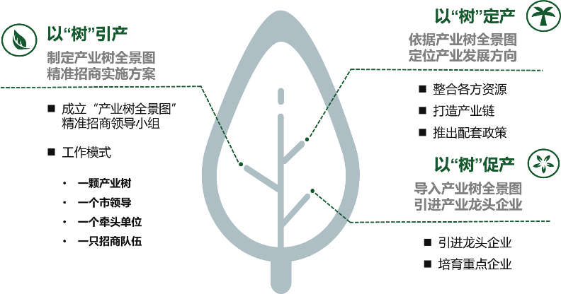 科學評估地區產業發展的現狀及問題,按照“強龍頭、補鏈條、聚集群”發展思路,編制產業樹全景圖,以“樹”定產、以“樹”引產、以“樹”促產,精準發力,助推招商引資,促進區域轉型升級,實現經濟高質量發展。
